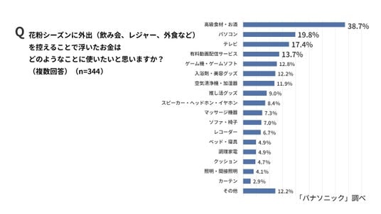 《花粉シーズンに外出を控えることで浮いたお金を「自宅での楽しみ」に使いたい人は4割以上。使い道として「高級食材・お酒」に続き、「パソコン」「テレビ」「有料動画配信サービス」が上位にランクイン。外出を控えた悔しさを自宅での楽しみを充実させる「リベンジイエナカ投資」で上書きしたい意識が見える結果に》