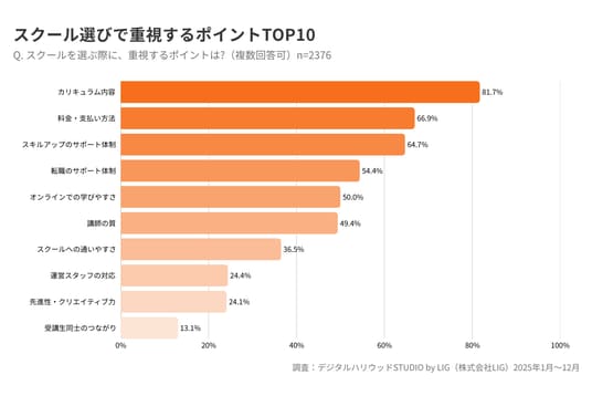- スクール選びで最も重視されるポイントは「カリキュラム内容」