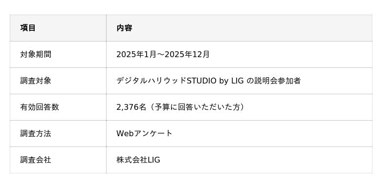 株式会社LIG(本社:東京都台東区、代表取締役:大山智弘、以下 LIG)が運営するWebクリエイタースクール「デジタルハリウッドSTUDIO by LIG」(以下、デジLIG)は、スクール説明会に参加した2,376名を対象に、Webデザインスクール検討時の予算・重視するポイントに関する調査を実施しました。