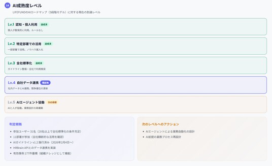 株式会社LIFEFUNDは会社のAI成熟度レベルを5段階に分けており、現状はレベル4の段階に到達している。
