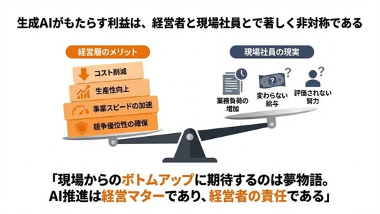 「生産性を上げても損をするだけだと学習した社員は、わざとAIの利用を控えたり、効率化した事実を隠したりするようになる。これは個人の合理的な自己防衛として極めて自然な反応だ」