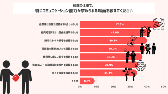 経理の仕事で特にコミュニケーション能力が求められる場面として、「他部署と数値や認識をすり合わせるとき」「経費処理できない理由を説明するとき」「締切やルールの遵守を依頼するとき」などがそれぞれ40%を超える結果となり、他部署の理解と協力を取り付ける「調整スキル」が求められていることがわかりました。