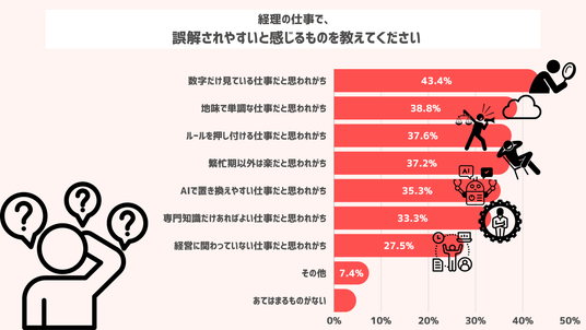 経理の仕事について周囲から誤解されやすいと感じる点として、「数字だけ見ている仕事だと思われがち(43.4%)」が最多となり、次いで「地味で単調な仕事だと思われがち(38.8%)」という結果になりました。”単純な事務作業というイメージ”を誤解だと考える経理経験者が多くいることがわかりました。
