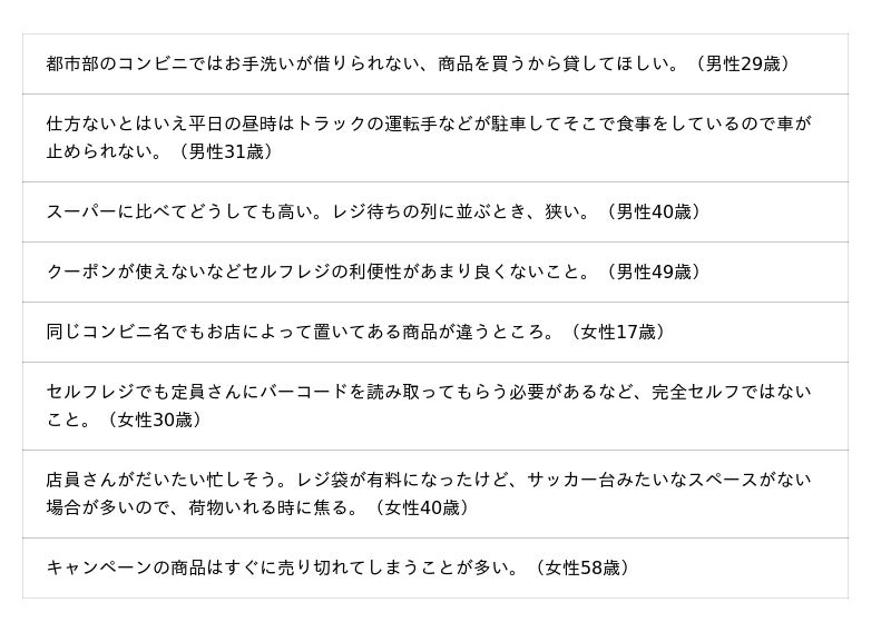 コンビニエンスストアの利用状況、自由記述にて不満に感じることなどについて聞いています。調査結果をお知らせいたします。