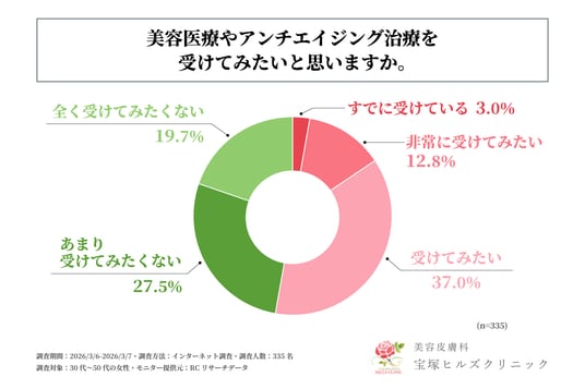また、動画に映る自身の顔が老けて見えた経験がある30代~50代の女性を対象に「美容医療やアンチエイジング治療を受けてみたいと思うか」を尋ねる設問への回答では、1位が「受けてみたい」で37.0%、2位が「あまり受けてみたくない」で27.5%、3位が「全く受けてみたくない」で19.7%、4位が「非常に受けてみたい」で12.8%、5位が「すでに受けている」で3.0%という結果になりました。1位と4位と5位の各回答の比率を合計すると52.8%となり、この結果から、動画に映る自身の顔が老けて見えた経験がある30代~50代の女性の半数以上が、美容医療やアンチエイジング治療を受ける意欲がある、またはすでに受けていることが判明しました。
