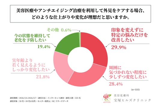 ・美容医療やアンチエイジング治療を利用して外見をケアする場合、理想とする主な仕上がりや変化は、「印象を変えずに特定の悩みだけを改善すること」や「周囲に気づかれない程度に少しずつ変化すること」