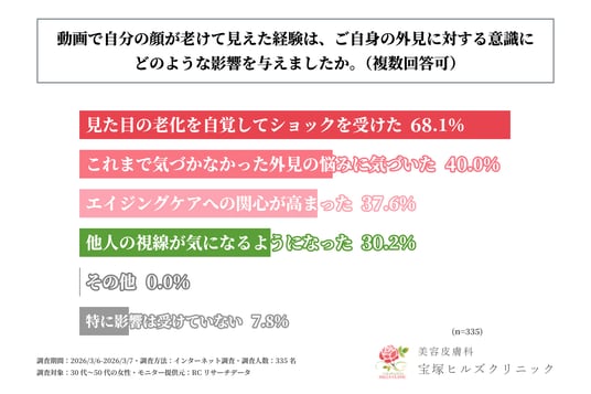 動画に映る自身の顔が老けて見えた経験がある30代~50代の女性の約7割が、その経験による影響として「見た目の老化を自覚してショックを受けた」と回答