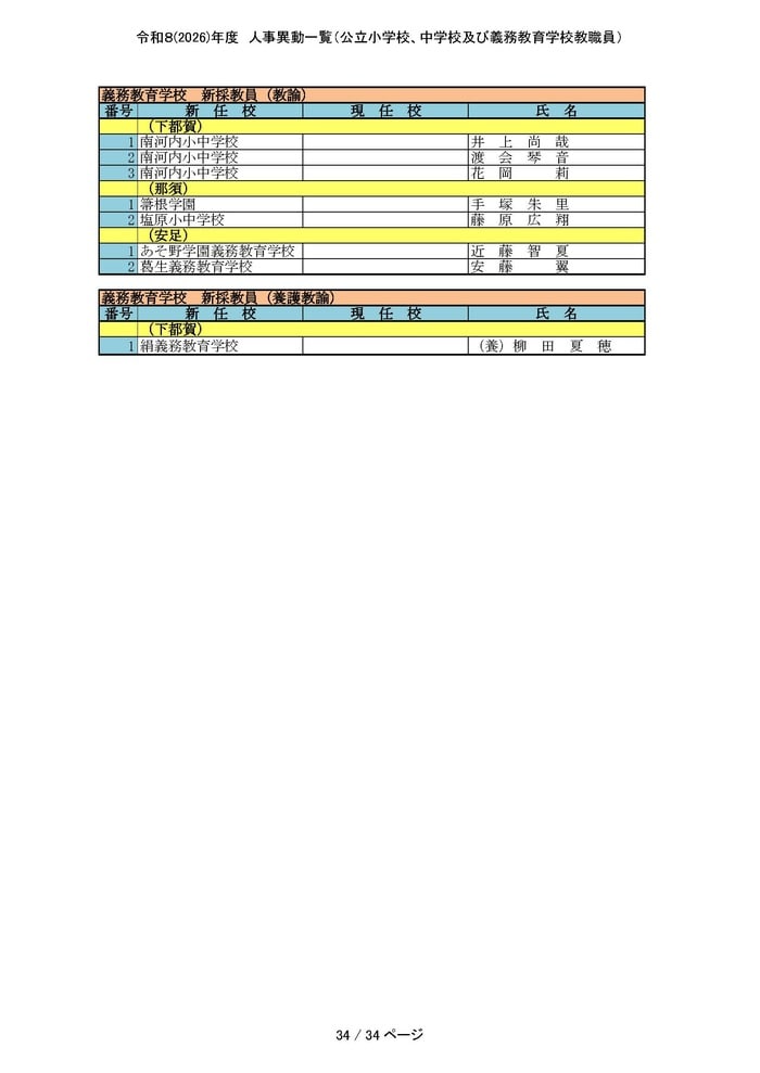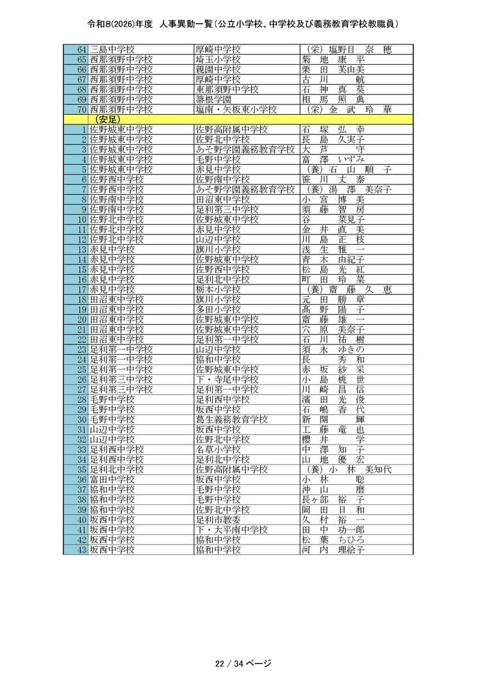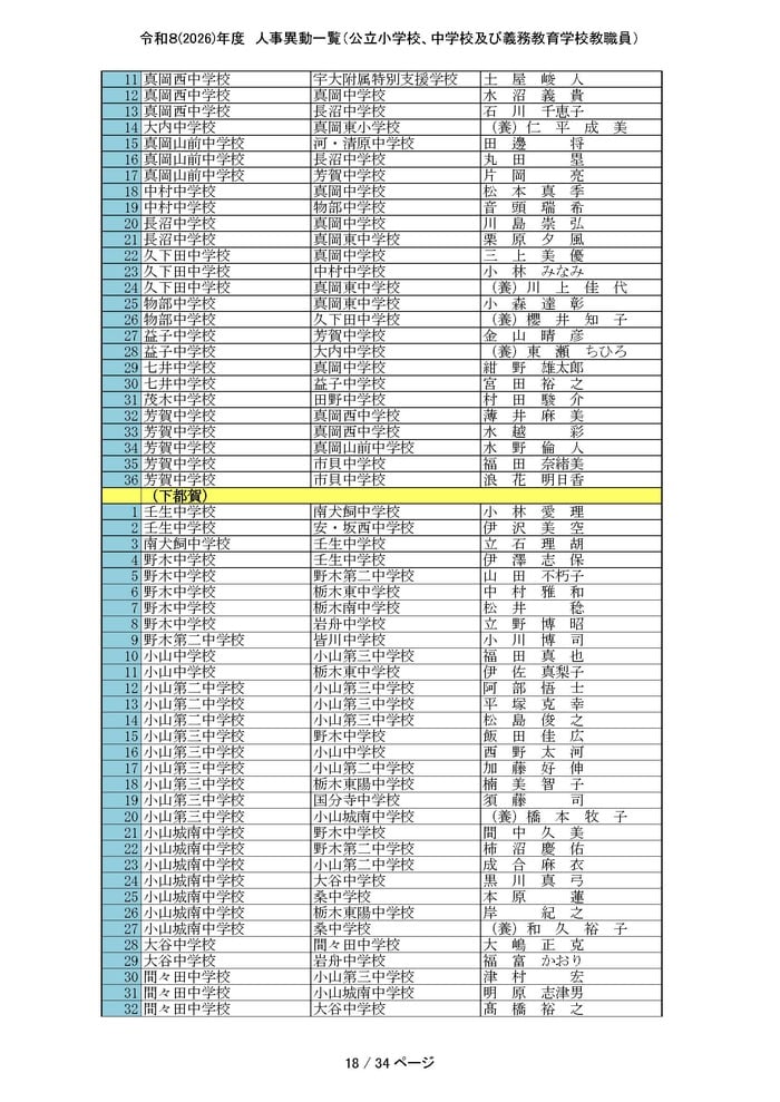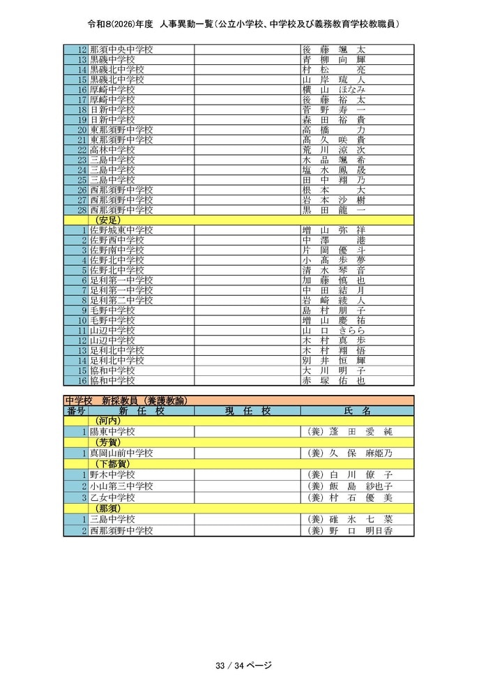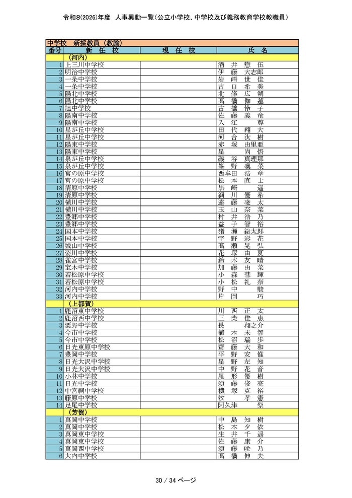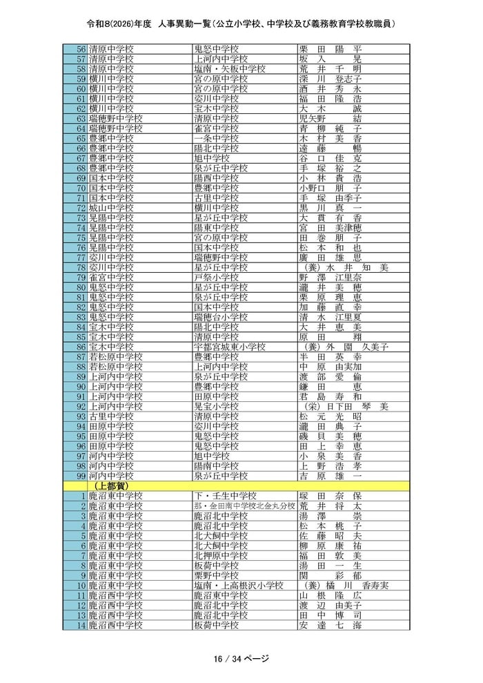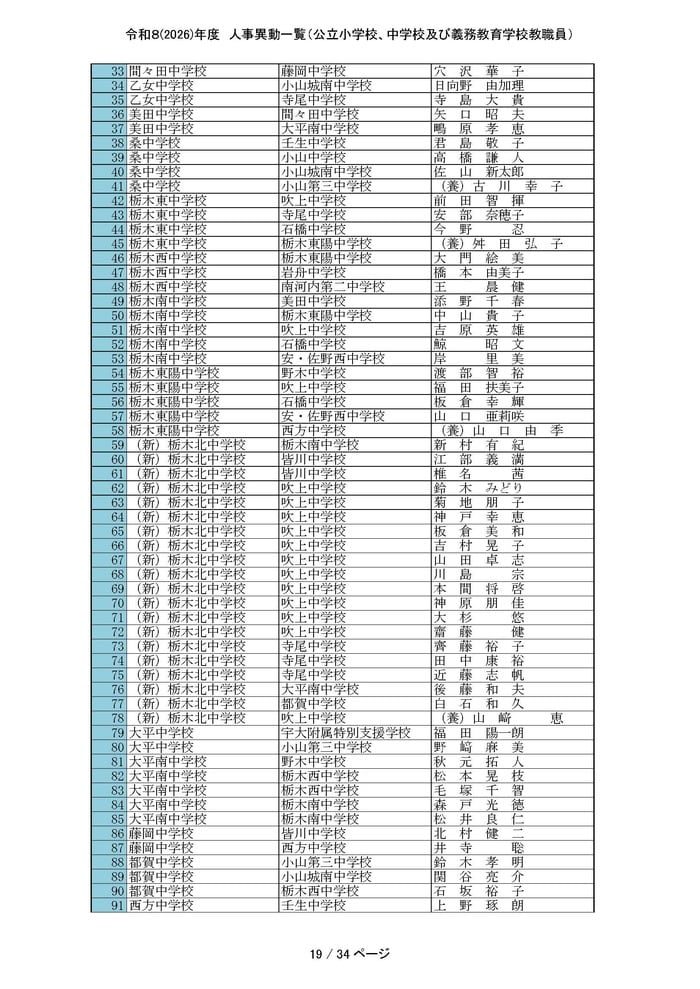 中学校・義務教育学校の主幹教諭と一般教員の人事をすべて掲載する。