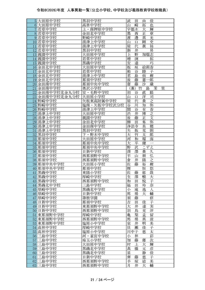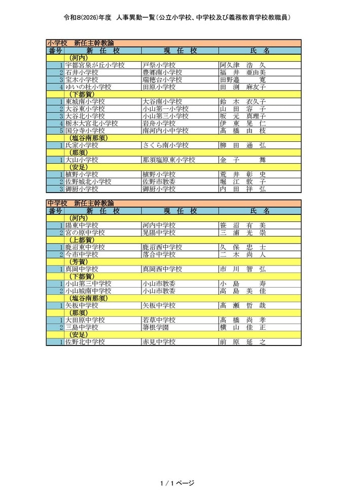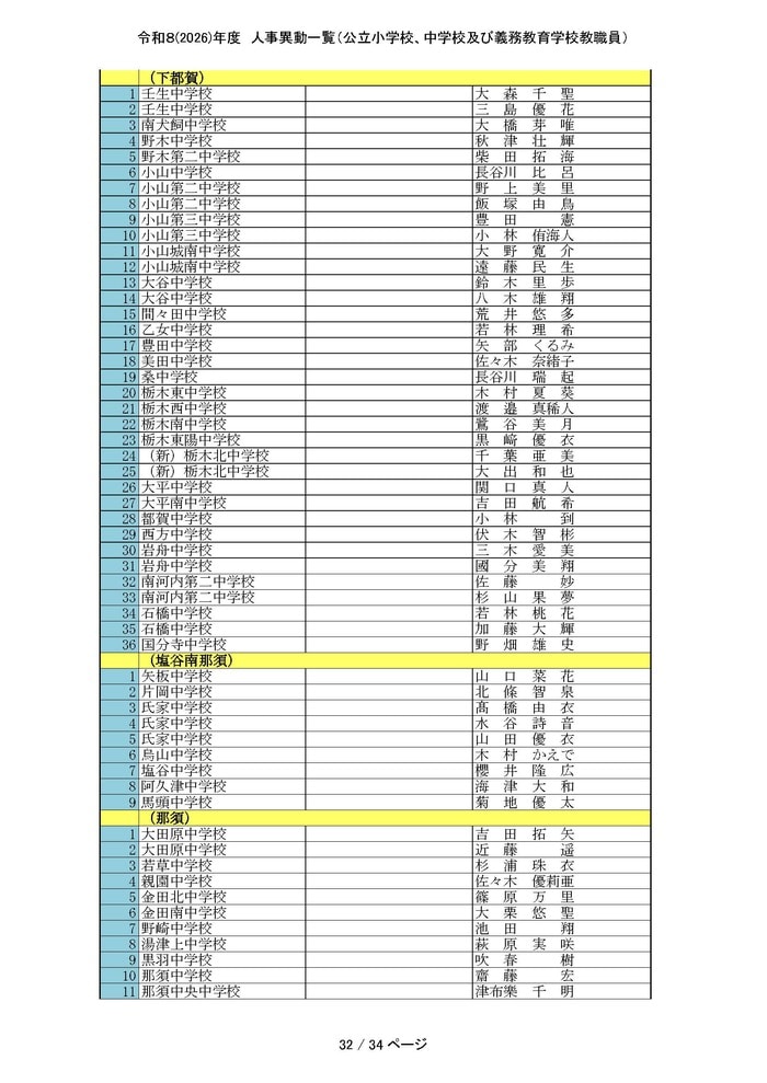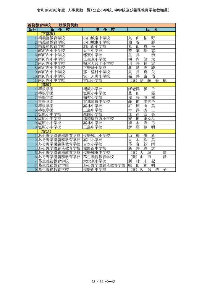 栃木県は4月1日付の公立小学校、中学校および義務教育学校の教職員の人事異動を発表した。