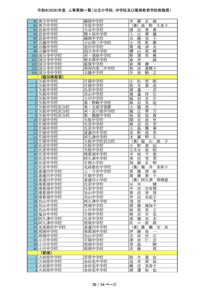 左から、新任校・現任校・氏名の順に表記する。