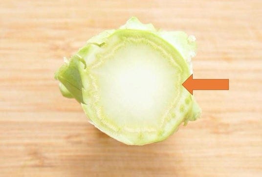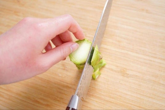 茎を使う時は、まず茎を縦にして、皮と一緒に筋(オレンジの矢印部分)も切り取ります。外側の皮を切る際に、筋部分にまで包丁の刃を入れましょう。筋の線に合わせてぐるっと一周したら筋部分まで取り除けた芯が残ります。その後はお好みの形にカットしてください。