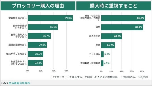 ブロッコリーを購入する理由で最も多いのは「栄養価が高いから」(69.8%)。約7割の人が栄養摂取に期待して取り入れていることがわかります。購入時には大半の人がつぼみの締まり具合や色などの「鮮度」(85.8%)、「価格」(82.2%)を気にしていることがわかります。