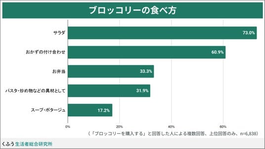 ブロッコリーがどのように食卓に登場することが多いかをたずねたところ、最も多いのは「サラダ」(73.0%)、続いて「おかずの付け合わせ」(60.9%)となりました。お弁当の彩りとしても重宝されていることがわかります。