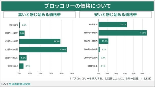 ブロッコリーの価格に対する印象を聞きました。「高いと感じ始める価格」として最も多かったのは、「200円~249円」(45.0%)、次いで「150円~199円」(38.8%)と、100円台後半から200円を超える価格で「高い」と感じ始めることがわかりました。逆に「安い」と感じ始めるのは、「100円~149円」(55.0%)が最も多く、100円台前半になるとお得な価格と認識され始めるようです。