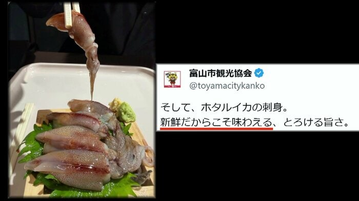 富山市観光協会がSNSに掲載した「ホタルイカの刺身」の写真が波紋を広げている。寄生虫対策として冷凍処理などが必要な食材にもかかわらず、「新鮮だからこそ味わえる」と紹介したため、「生で食べられると誤解する」と指摘が相次いだ。