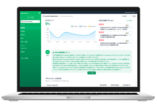 AI検索時代における企業やサービスの見え方を可視化し、改善につなげるAI検索プラットフォーム「secondz Agentsense」を提供しています。生成AI上での認識や参照状況の把握から、改善提案までを支援しています。