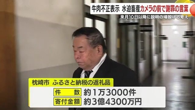 鹿児島県指宿市の水迫畜産が、ホルスタイン種を「黒毛和牛」、県外産を「鹿児島県産」と偽ってふるさと納税の返礼品などに使っていた問題。3月25日、水迫政治社長が枕崎市役所を訪れ、前田祝成市長に直接謝罪した。現時点で明らかになっている寄付金額の総額はすでに7億円を超えており、県内8つの市と町に広がる被害の全容はいまだ明らかになっていない。