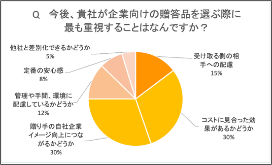 (3) 企業贈答は大企業で減少、物価高が贈答支出に影響する中で「形式より意味」へのシフトが起きている企業向けの贈答頻度について、大企業は4割がややまたは明らかに「減っている」と回答する一方、中小企業は5割が「変わらない」と回答し、企業規模による違いが見られました。また、今後企業向けの贈答品選びで最も重視することとして、「贈り手の自社イメージ向上につながるかどうか」・「コストに見合った効果があるかどうか」(共に30%)が挙げられていました。
