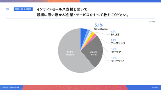 「Q2. インサイドセールス支援と聞いて最初に思い浮かぶ企業・サービスをすべて教えてください。(自由回答)」(n=200)と質問したところ、「Salesforce」が5.1%、「BALES」「アースリンク」「セイヤク」「セレブリックス」が各1.9%という回答となりました。