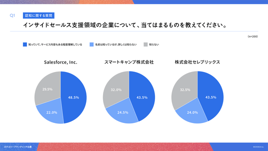 「Q1. インサイドセールス支援領域の企業について、当てはまるものを教えてください。」(n=200)と質問したところ、「知っていて、サービス内容もある程度理解している」と回答した割合は、Salesforce, Inc.は48.5%、スマートキャンプ株式会社が43.5%、株式会社セレブリックスは43.5%という回答となりました。