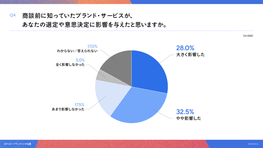 「Q4. 商談前に知っていたブランド・サービスが、あなたの選定や意思決定に影響を与えたと思いますか。」(n=200)と質問したところ、「大きく影響した」が28.0%、「やや影響した」が32.5%という回答となりました。