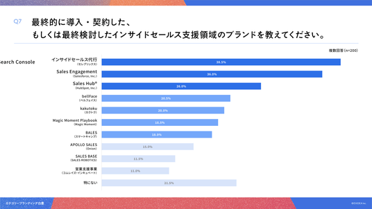 「Q7. 最終的に導入・契約した、もしくは最終検討したインサイドセールス支援領域のブランドを教えてください。(複数回答)」(n=200)と質問したところ、「インサイドセールス代行(セレブリックス)」が38.5%、「Sales Engagement」が36.0%、「Sales Hub(R)」が26.0%という回答となりました