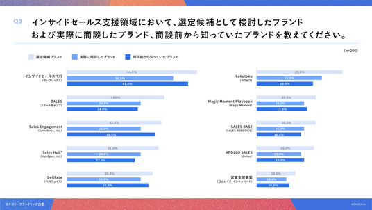 「Q3. インサイドセールス支援領域において、選定候補として検討したブランドおよび実際に商談したブランド、商談前から知っていたブランドを教えてください。」(n=200)と質問したところ、選定候補ブランドは「インサイドセールス代行(セレブリックス)」が44.5%、実際に商談したブランドは「インサイドセールス代行(セレブリックス)」が36.5%、商談前から知っていたブランドは「インサイドセールス代行(セレブリックス)」が41.0%という回答となりました。