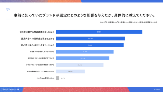 「Q5. Q4で「大きく影響した」「やや影響した」と回答した方にお聞きします。事前に知っていたブランドが選定にどのような影響を与えたか、具体的に教えてください。(複数回答)」(n=121)と質問したところ、「他社と比較する際の基準になったから」が60.3%、「提案内容への信頼度が高まったから」が47.9%、「安心感があり、検討しやすかったから」が47.1%という回答となりました。