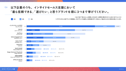 「Q6. Q1で全て「知らない」以外を回答した方にお聞きします。以下企業のうち、インサイドセールス支援領域において「最も信頼できる」「選びたい」と思うブランドを順に3つまで挙げてください(順位付けかつ上位3つまで)」(n=171)と質問したところ、選出数が多い順に、1位に選ばれた割合の”1位率”はインサイドセールス代行(セレブリックス)が73.0%、BALESが19.8%、bellFaceが10.5%という回答となりました。*なお、本調査では、回答者に対して「最も信頼できる」「選びたい」と思うブランドを、提示した10ブランドの中から最大3つまで選択し、1位から3位までの順位をつけて回答いただきました。