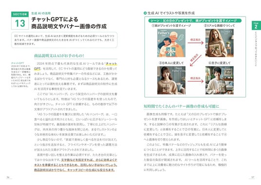 EC×AI 新時代のEC運営まで網羅さらに本書では、ChatGPTやGeminiをはじめとする生成AIの活用についても解説。商品説明文の作成、バナー制作、カスタマーサポートなど、これまで人手で行っていた業務は、AIを前提とした設計へと変化しつつあります。本書では、こうした変化を踏まえ、「どの業務に、どのようにAIを活用するか」まで踏み込み、これからのEC運営に必要なAI時代のノウハウまで網羅しています。