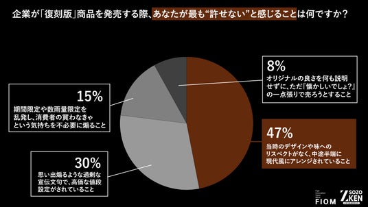 企業が「復刻版」商品を発売する際、最も“許せない”と感じることは「当時のデザインや味へのリスペクトがなく、中途半端に現代風にアレンジされていること」(47%)が圧倒的1位となりました。