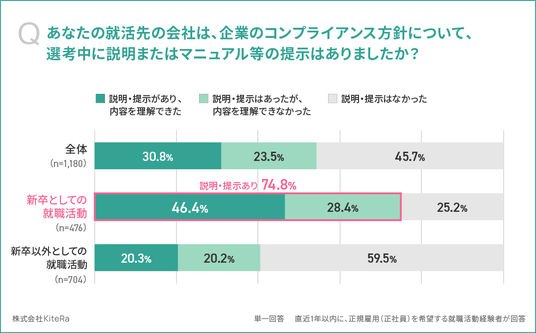 - 新卒就活者の74.8%が、企業のコンプライアンス方針について、選考中の説明・マニュアル提示があった