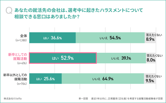 「あなたの就活先の会社は、選考中に起きたハラスメントについて相談できる窓口はありましたか(単一回答)」と質問したところ、新卒としての就職活動では、52.9%が「はい」、39.1%が「いいえ」、8.0%が「答えたくない」と回答しました。