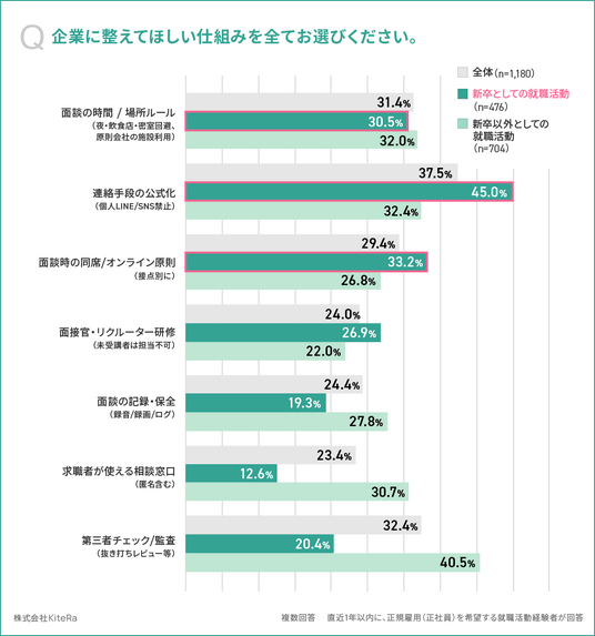 「企業に整えてほしい仕組みを全てお選びください(複数回答)」と質問したところ、新卒としての就職活動では、回答が多い順に、45.0%が「連絡手段の公式化(個人LINE/SNS禁止)」、33.2%が「面談時の同席/オンライン原則(接点別に)」、30.5%が「面談の時間/場所ルール(夜・飲食店・密室回避、原則会社の施設利用)」と回答しました。