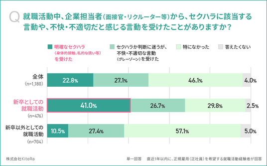 「就職活動中、企業担当者(面接官・リクルーター等)から、セクハラに該当する言動や、不快・不適切だと感じる言動を受けたことがありますか(単一回答)」と質問したところ、新卒としての就職活動では、41.0%が「明確なセクハラ(身体的接触、私的な誘い等)を受けた」、26.7%が「セクハラか判断に迷うが、不快・不適切な言動(グレーゾーン)を受けた」、29.8%が「特になかった」、2.5%が「答えたくない」と回答しました。