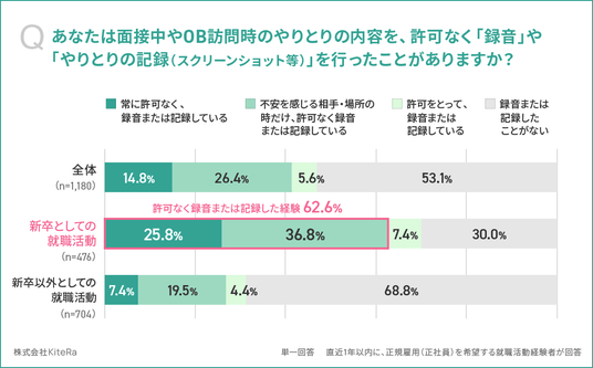 新卒就活者の62.6%が「無許可で録音・記録した経験あり(常に許可なく、録音または記録している/不安を感じる相手・場所の時だけ、許可なく録音または記録している)」ということがわかりました。