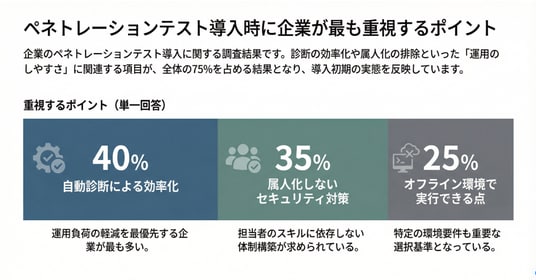 この結果から、企業はセキュリティ診断に対して高度な専門性よりも、継続的に運用しやすい仕組みを重視していることが分かります。