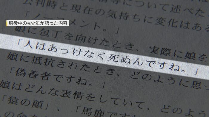 「娘に包丁を向けた時、実際に娘を刺した時、何を感じたか」。気持ちを振り絞るような弥里さんの母親の問いかけに、元少年の回答は「人はあっけなく死ぬんですね」という、信じられない言葉だった。