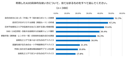 訪日旅行の計画にAIを利用したと回答した人に、具体的な活用方法を尋ねたところ、最も多かった回答は「自分の好みに合った『穴場』や『隠れ家スポット』の検索」で52.3%となりました。次いで、「自分だけのオリジナル旅程(周遊ルート)の作成」(47.2%)、「日本や訪問先エリアの伝統文化などに関する深い情報収集」(43.6%)が上位に挙がりました。