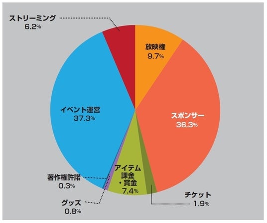 また、市場を構成する項目としては、オンラインとオフラインのハイブリッド開催が定着したイベント運営と、大会やチームに対するスポンサー費用が、それぞれ全体の35%以上を占めています。また、関連グッズやストリーミングに関しては高い成長率で伸長しており、今後産業内における存在感を一層増していくと考えられます。
