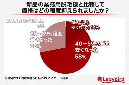 中古脱毛機の導入による価格差について調査したところ、「40~59%程度安くなった」と回答したサロン経営者が58%と最も多く、過半数が新品価格の約半額水準で導入している実態が明らかになりました。