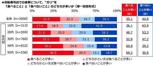 “ガリ”を「食べること」と「食べないこと」のどちらが多いか聞いたところ、『食べることが多い(計)』は55.1%、『食べないことが多い(計)』は44.9%で、ガリを食べる人が多数派となりました。
