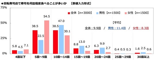 全回答者(3,000名)に、回転寿司店で寿司を何皿程度食べることが多いか聞いたところ、「5皿~9皿」や「10皿~14皿」(いずれも38.5%)に多くの回答が集まり、平均は9.9皿でした。