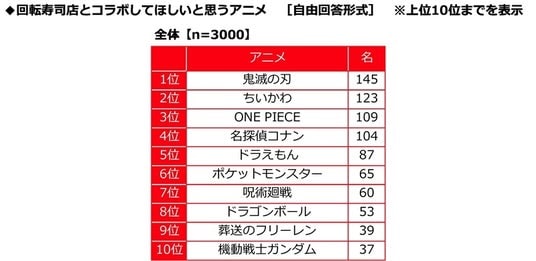 - 回転寿司店とコラボしてほしいと思うアニメTOP3 「鬼滅の刃」「ちいかわ」「ONE PIECE」