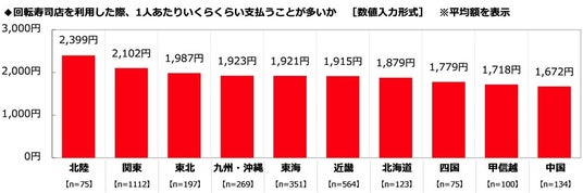エリア別にみると、支払うことが多い金額の平均は北陸(2,399円)が最も高くなり、関東(2,102円)、東北(1,987円)が続きました。