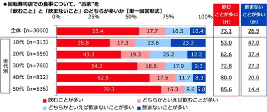 - 「回転寿司店ではお茶を飲むことが多い」7割強、50代では8割半