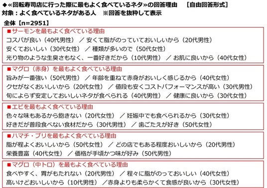 ≪最もよく食べているネタ≫の回答について、その理由を聞いたところ、1位の「サーモン」については「安くて脂がのっていておいしいから」「安くておいしい」「種類が多いので」「お肌に良いから」といった理由が挙がりました。手ごろな価格でおいしく食べられるといった理由が多くみられました。2位の「マグロ(赤身)」については「旬によらず安定しておいしいネタが食べられる」「旨みが一番強い」、3位の「エビ」については「色々な味もあるから飽きない」「歯ごたえが好き」等の理由が挙がりました。