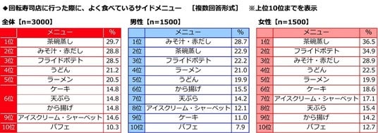 次に、回転寿司店に行った際に、よく食べているサイドメニューを聞いたところ、1位「茶碗蒸し」(29.7%)、2位「みそ汁・赤だし」(28.8%)、3位「フライドポテト」(28.5%)、4位「うどん」(21.2%)、5位「ラーメン」(20.5%)となりました。