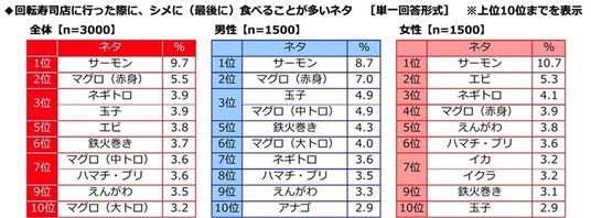 男女別にみると、男女とも1位は「サーモン」(男性8.7%、女性10.7%)となり、男性では2位「マグロ(赤身)」(7.0%)、3位「玉子」「マグロ(中トロ)」(いずれも4.9%)、女性では2位「エビ」(5.3%)、3位「ネギトロ」(4.1%)となりました。