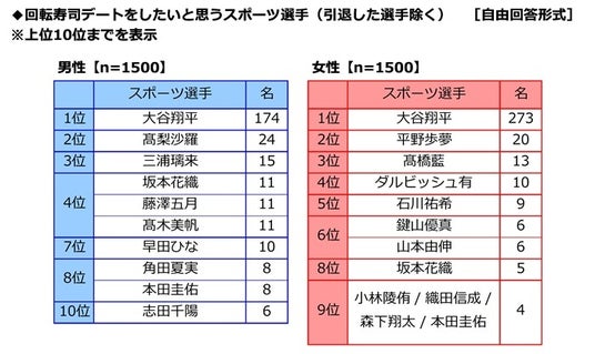 また、回転寿司デートをしたいと思うスポーツ選手を聞いたところ、男性回答・女性回答ともに「大谷翔平さん」(男性174名、女性273名)がダントツとなりました。